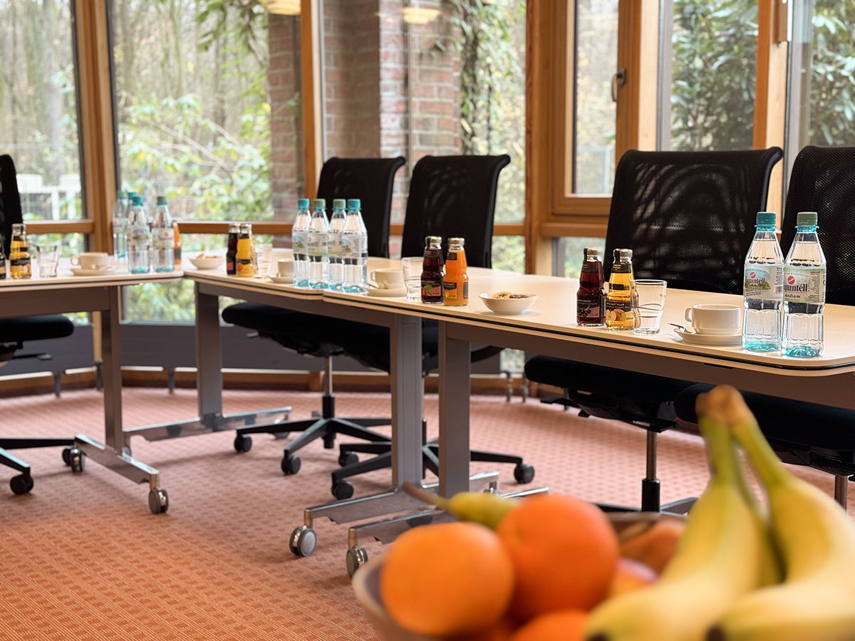 Tagungsraum inkl. je 1x Saft, Wasser je Teilnehmer und Kaffeepause am Vor- oder Nachmittag, zusätzliche Auswahl für Kuchen, Kekse und Obst möglich